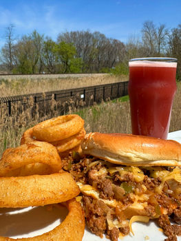 ● Roast Beef Sandwich featuring beer braised onions & peppers and homemade horseradish aioli